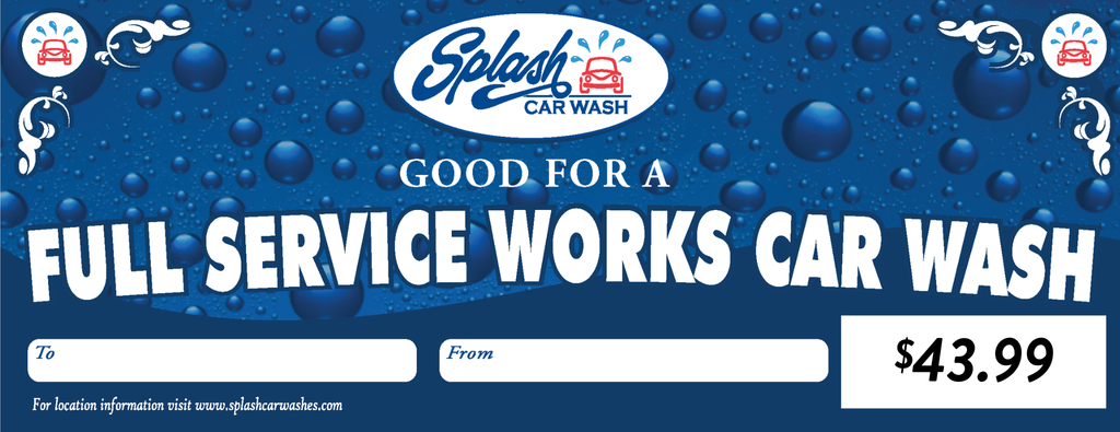 Full Service Wash plus Triple Foam Polish, Clearcoat Sealer, Tire Shine, Wheel Brite and Undercarriage Wash. Valid only at Full Service sites, not valid at Splash Express sites.
